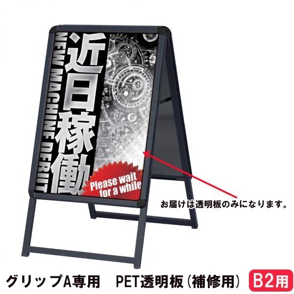 看板が倒れた等で、透明板にキズ・破損したときに。 製造国:日本 素材・材質:PET 仕様:厚み:1mmB2サイズ用 ※サプライヤー直送品 ご注文後5~6営業日後の出荷となります【商品名】グリップA専用 PET透明板(補修用) B2用075F-32550-2*