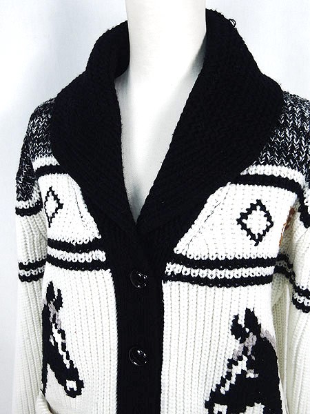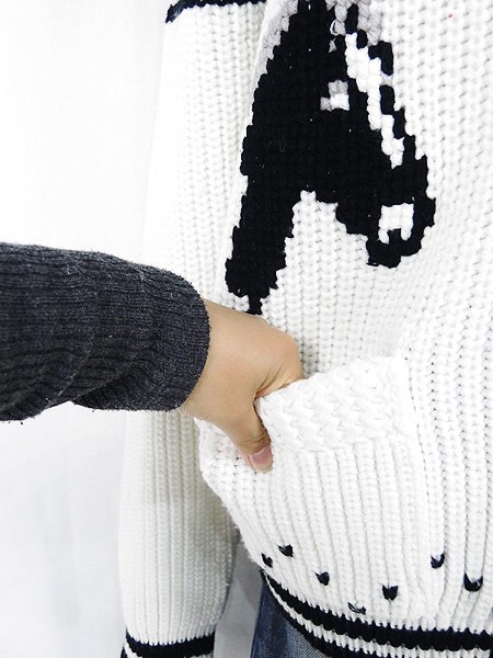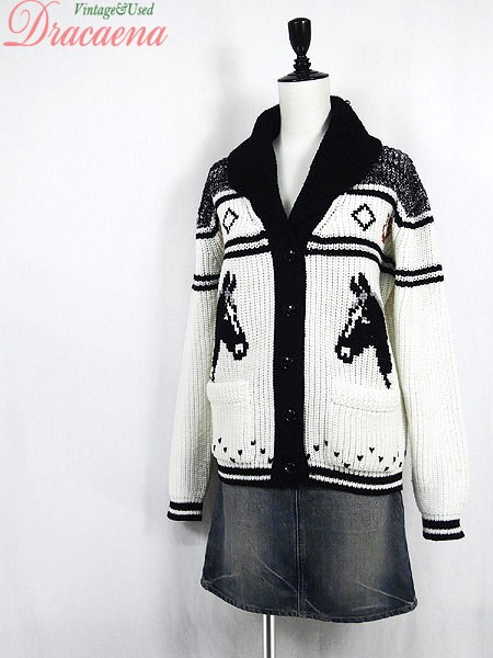 Ladies ブランド- カラー白ベース・黒 メール便不可 コンディション★★★ 素材アクリル 表記サイズL 実寸サイズ 着丈 62.5 cm 身幅 55 cm 肩幅 49 cm 袖丈 60 cm ※ウエスト・ヒップ以外は平置き採寸