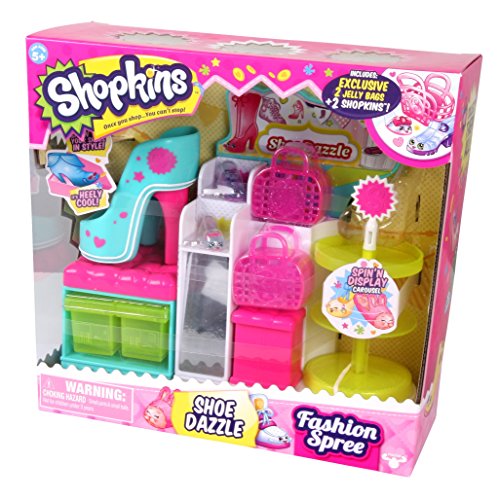 -. Binding : Toy -. Brand : Shopkins -. EAN : 0789264265195 -. Feature : SHOE DAZZLE -Little ones can show off their favorite pair of play shoes by displaying them on the high heel shoe stand or have her dolls check out their style in the mirror. / MAKES A GREAT GIFT - This Shopkins Fashion Spree Shoe Dazzle will make a thoughtful gift for your little one. Save on time, money, and headache while doubling the fun for your fabulous girl. / CREATIVE ROLE PLAY - This Shopkins toy can help encourage children to use their imagination by engaging in pretend play. They can set up their own store or act as if it is their own fancy closet. / DOWNLOAD THE SHOPKINS APP - Now you can have even more fun with the new Shopkins app. / PACKAGE CONTENTS - Shopkins Fashion Spree Shoe Dazzle playset comes with 2 exclusive Shopkins and 2 jelly bags. -. IsAdultProduct : 0 -. ItemPartNumber : 56034 -. Label : Shopkins -. LegalDisclaimer : Not suitable for children under 3 years of age -. Manufacturer : Shopkins -. Model : 56034 -. MPN : 56034 -. NumberOfItems : 1 -. PackageQuantity : 1 -. PartNumber : 56034 -. ProductGroup : Toy -. ProductTypeName : TOYS_AND_GAMES -. Publisher : Shopkins -. Studio : Shopkins -. Title : Shopkins Fashion Spree Shoe Dazzle -. UPC : 783185025746 -. Warranty : No Warranty