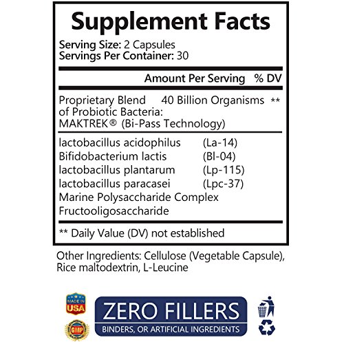 Supplement Facts (per serving/2 capsules): Proprietary Blend of Probiotic Bacteria - 40 Billion Organisms MAKTREK® (Bi-Pass Technology) Lactobacillus acidophilus (La-14) Bifidobacterium lactis (Bl-04) Lactobcillus plantarum (Lp-115) Lactobacillus paracasei (Lpc-37) Marine Polysaccharide Complex Fructooligosaccharide Other Ingredients: Cellulose (Vegetable Capsule), Rice maltodextrin, L-Leucine.
