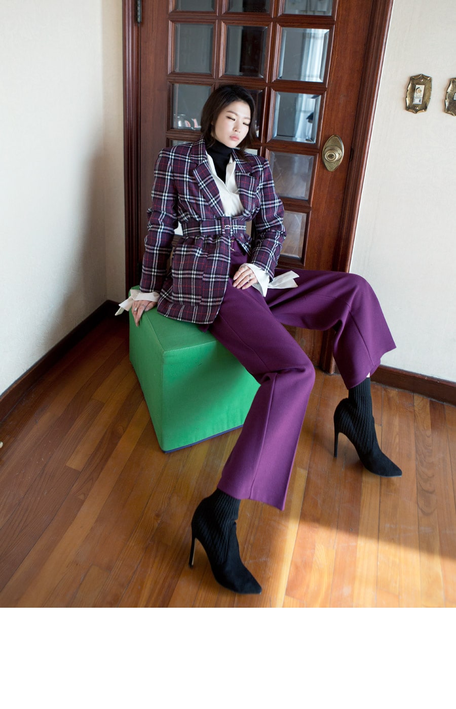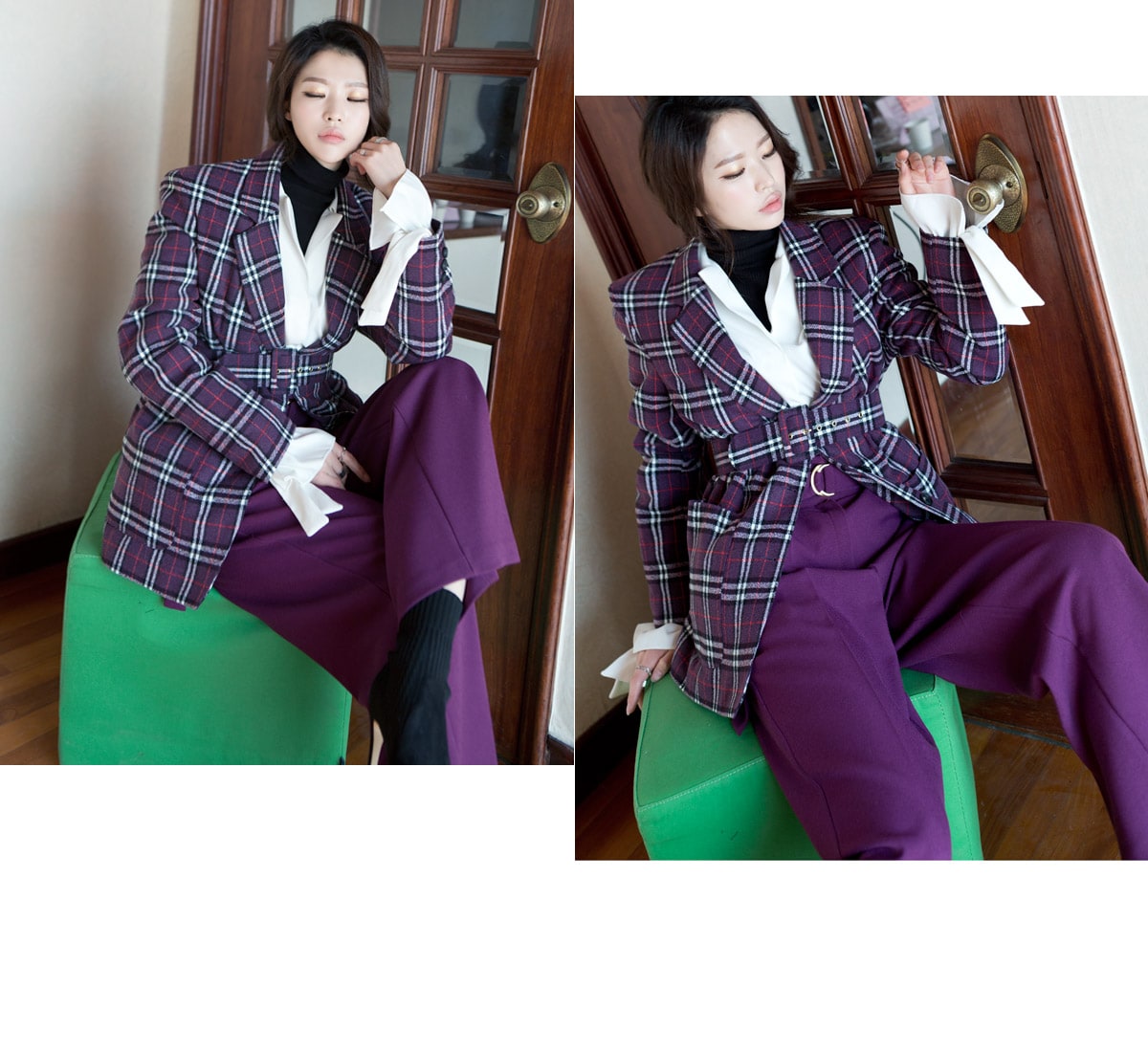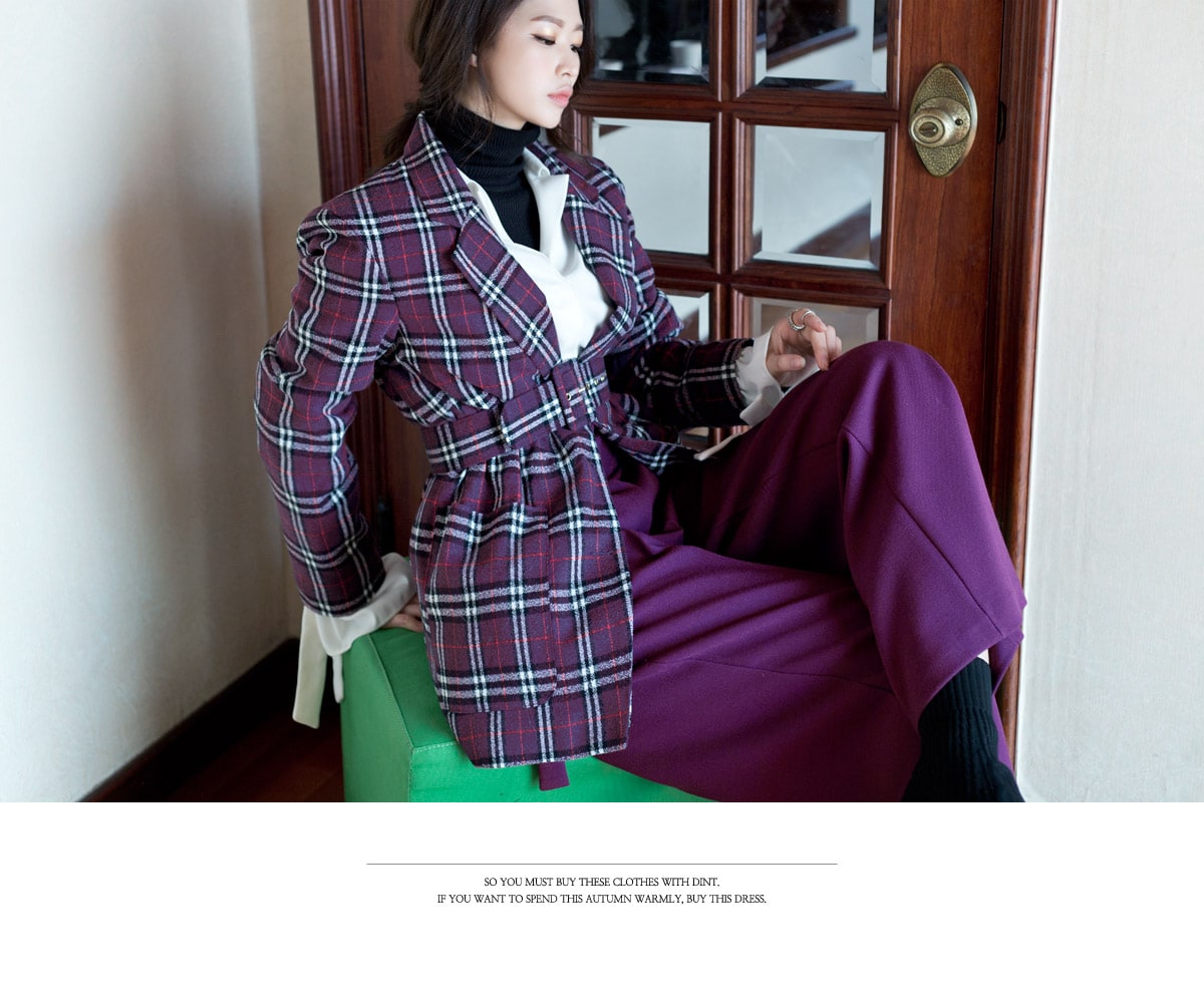 J-4819 로이츠 체크믹스 누빔자켓(벨트set) Purple mix
