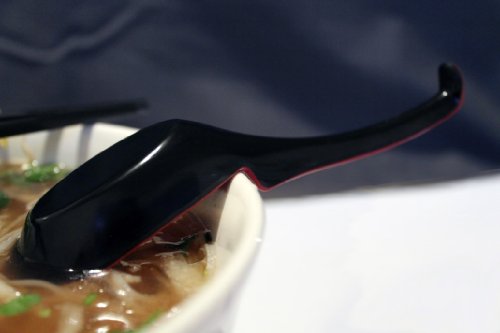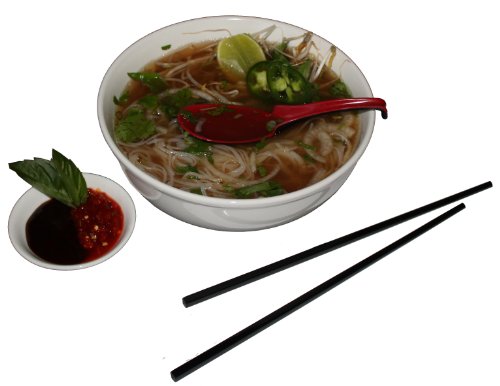 This complete pho noodle bowl set is a must for all Pho lovers. Includes a large restaurant quality ceramic soup bowl that safely holds 48 fluid ounces and is both microwaveable and dishwasher safe. It's s a perfect size that should fit most medium and large sized orders of pho from your local restaurant. Also included is a great 3.75 inch sauce dish that you would commonly see at most pho restaurants, used for dipping sauces. The soup spoon is made of durable melamine and it's design makes it easy to rest the spoon on the rim to prevent it from falling into the bowl. Comes with a pair of black melamine chopsticks. Perfect for your pho orders to-go.Feature
