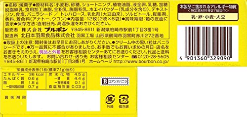 原材料:小麦粉、砂糖、ショートニング、植物油脂、液全卵、乳糖、加糖脱脂練乳、食用加工油脂、全粉乳、脱脂粉乳、ホエイパウダー(乳成分を含む)、デキストリン、食塩、バニラシード / トレハロース、乳化剤(大豆由来)、ソルビトール、膨脹剤、香料、着色料(アナトー、ウコン)