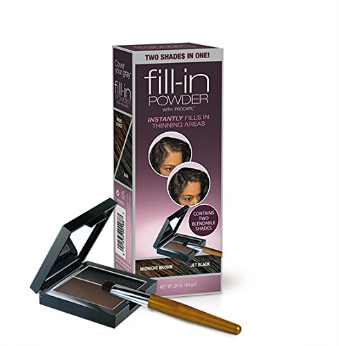 The saying goes, 2 is better than 1! In response to our best selling Fill-In-Powder, Cover Your Gray is proud to introduce the Fill-In-Powder Two Shades In One, the leading tinted thinning hair solution helping women and men to love their hair again! Formulated with Procapil, a patented complex of natural botanicals, Fill-In-Powder not only fills in thinning hair and/or balding areas, it also is working to help promote growth and prevent hair loss. Fill-In-Powder Two Shades In One is available in 4 split shades, is rain proof, sweat proof and blends seamlessly so no one can tell you have it on. Includes compact with mirror and brush applicator Ideal for thinning hair, bald spots Perfect for highlighted hair Formulated with Procapil, a patented complex of natural botanicals that work to help promote growth and prevent hair loss Fights follicle aging Fortifies and rejuvenates hair with each application Rain proof, sweat proof Easily washes out with shampoo Compatible with all hair color and hair types No water needed, just apply to thinning or balding areas Will not mat or clumpFeature