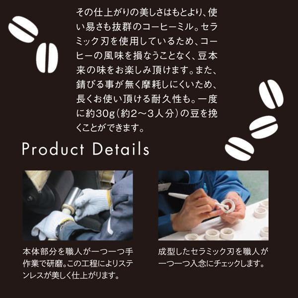 | その仕上がりの美しさはもとより、使い易さも抜群のコーヒーミル。においが付きにくく、耐久性に優れているセラミック刃を使用しているため、コーヒーの風味を損なうことなく、豆本来の味をお楽しみ頂けます。 |