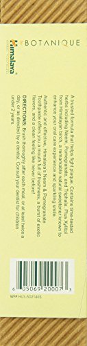 ReleaseDate : 2015-05-15 Studio : Himalaya Herbal Healthcare Publisher : Himalaya Herbal Healthcare Binding : Health and Beauty Product Description Himalaya Herbal Healthcare, a family owned company for three generations, has manufactured a complete line of pharmaceutical grade herbal products since 1930. With its global headquarters in Bangalore, India, Himalaya is the maker of LiverCare (internationally known as Liv.52), a best-selling liver support formula. Available in 76 countries with US headquarters in Houston, Texas, Himalaya's herbal supplements contain 100% herbal extracts and are encapsulated in vegetarian Capsugel Vcaps. Himalaya combines the rich value of an old system of natural medicine with modern technology, including scientific assessment of efficacy using primary clinical research, Good Manufacturing Practices (GMPs) and quality controls, using sophisticated chromatographic fingerprinting techniques. Himalaya proudly carries the ISO-14001:2004 certificate of environmental management for its critical systems and procedures to control land, water and air pollution, as well as an ISO 9001:2001 certification, the most rigorous ISO conformance standard, for excellence in manufacturing as established by the International Organization for Standardization. In addition to manufacturing Himalaya Herbal Healthcare formulas, the company is also the maker of Himalaya Pure Herbs and Organique by Himalaya body care products, organically grown and free from over 200 synthetic ingredients. A mouth full of freshness, a burst of exotic flavors and a smile you can count on. Dependable time tested ingredients like Neem, Triphala and Pomegranate clean your teeth and promote healthy gums. Neem, twigs of which were used traditionally to clean teeth, gives this formulation its sparkle. Pomegranate helps promote healthy gums. Triphala has mouth freshening and astringent properties. You will smile brightly from the results with a fresh feeling mouth, polished teeth and healthy gums! 0
