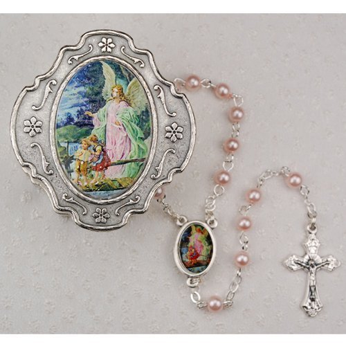 Guardian Angel Pink Rosary with Box Baptism Christening Communion Gift