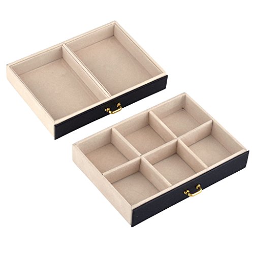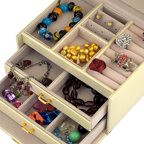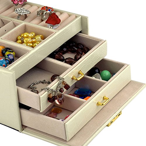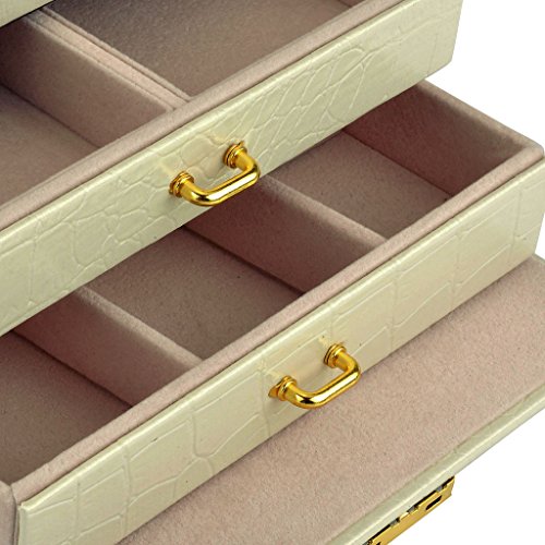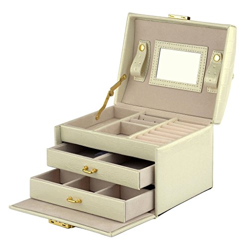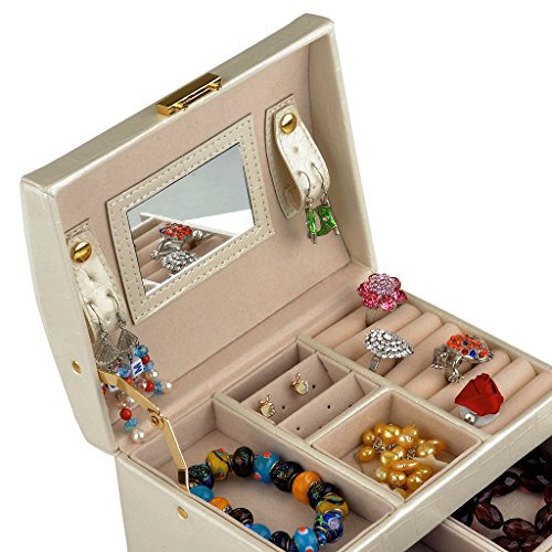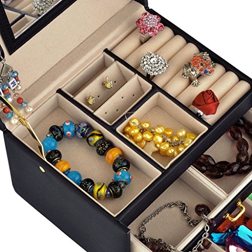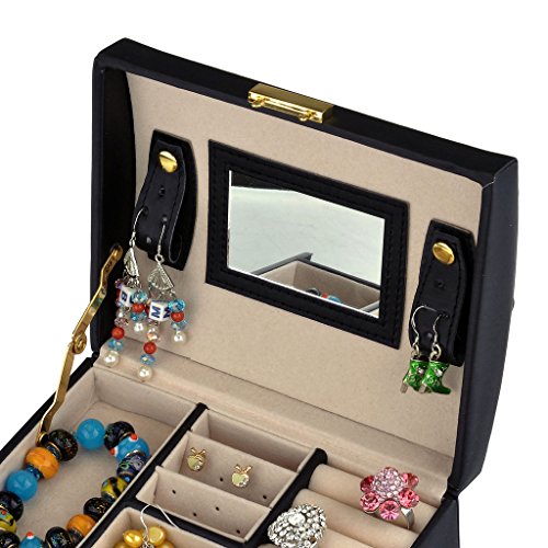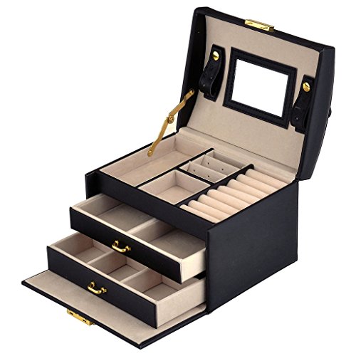 -. Feature : Made of quality black faux leather and soft beige velvet, this jewelry box is superexcellent to protect your beloved jewelry from scratch and damage / Lightweight to carry and cute enough to be a gift,1.83 Lbs (0.83 kg), 6.8" L x 5.5" W x 5.1" H (17.5 x 14 x 13 cm) / Multi-functional jewelry case, suits for necklaces, bracelets, watches, earrings, ear studs, hairpins, cufflinks, brooches and other jewelry, nice gift idea / Lock with a key ; mirror on top lid; removable earring holders£»The mini travel jewelry box is specially designed for journey, portable and space saving / 3 layers with 2 large drawers, 10 compartments in different sizes,1 ring set,2 ear stud cards,2 drop Earrings case