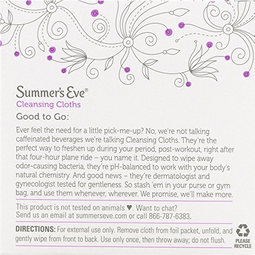 ReleaseDate : 2017-04-24 Studio : Summer's Eve Publisher : Summer's Eve Binding : Health and Beauty Product Description Designed to help wipe away odor-causing bacteria, Summer's Eve Cleansing Cloths are a quick, discreet way to freshen up when you're on the go, which is probably most of the time. Stash them in your purse or gym bag, and use them when you're pressed for time or don't have time to shower. Our Cleansing Cloths are dermatologist and gynecologist tested, and the gentle hypoallergenic formula won't irritate your skin. Summer's Eve Cleansing Cloths are available in three scents, and come individually wrapped or in a secure soft pack for discreet and convenient use. 0
