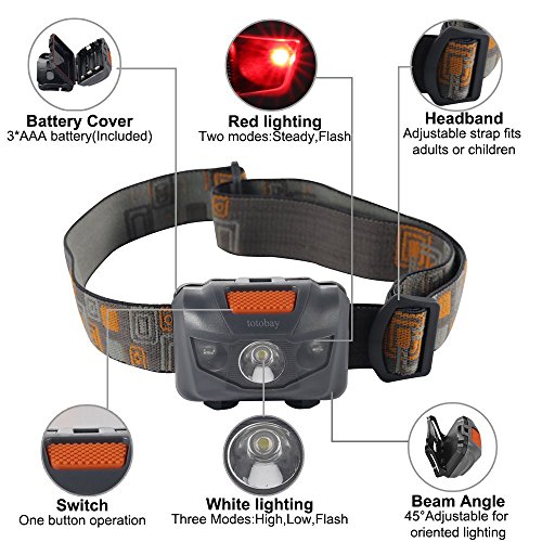 Waterproof LED Headlamp Flashlight- 4 Modes(White lights/ Red Lights and SOS)- Great for Reading Running, Hiking, Camping, Kids and More, Long Battery Life (3AAA Batteries Included)