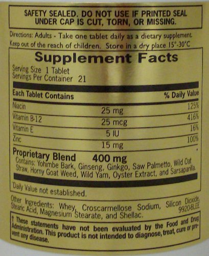 You Get 6 Bottles each bottle contains 21 tabletsIron Man PlusDietary Supplement All vitamins are at least two years from expiringNatural Formula For Increased Energy and StaminaIncreased Sexual Function *Serving Size 1 Tablet Niacin 25mg Vitamin B-12 25mg Vitamin E 5 5 IU Zinc 15 mgProprietary Blend 400 Mg Proprietary Blend 400 mg Product is safety Sealed direct from the manufacturerFree Shipping to the U.S international rates apply*These statements have not been evaluated by the FDA. This product is not intended to diagnose treat cure or prevent any disease