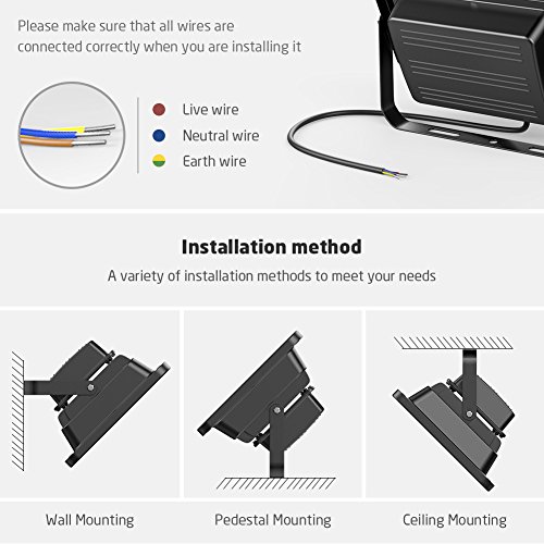 - Waterproof construction, rating IP65. Wide beam angle: 120 degree. Instant On, no shadow. Work on 85-265V. Flexible and easy installation. It can be ceiling-mounted, wall-mounted, and ground-mounted with the durable mental bracket.