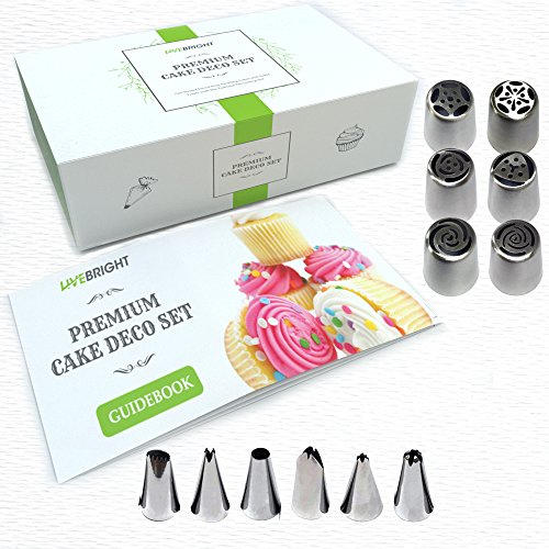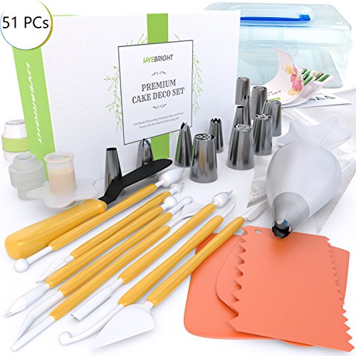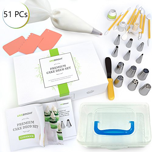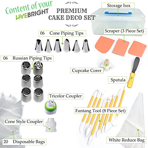 51 PIECES SET: Live Bright’s Premium cake and cupcake decoration set includes the full range of the bakery tools: 6 Cone Piping tips, 6 Russian Piping Tips, 3 different Scrapers, Cupcake Corer, Spatula, Tricolor Coupler, 8 Fantang tools, Cone Style Coupler, 20 Disposable Icing Bags, Reusable Silicone Icing Bag, Instruction guide, Beautiful Paper Gift Box and a Durable Storage Case to keep all the decorating tools protected.