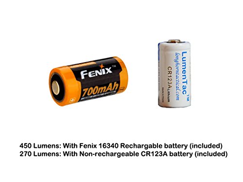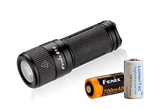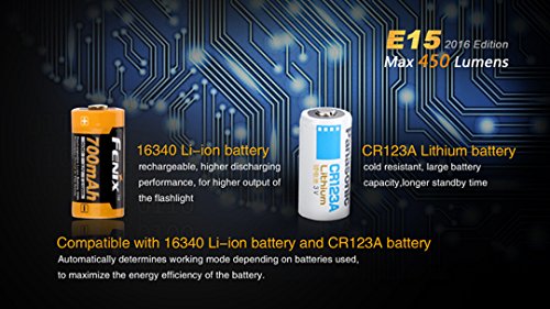 Fenix E15 Maximum 450 lumens Pocket Keychain LED Flashlight with Fenix 16340 Rechargeable Battery and LumenTac CR123A Battery