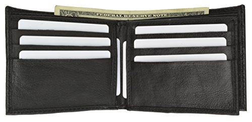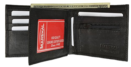 Product DescriptionMaterial: Genuine Leather Bi-fold Size: 9" x 3.5" Credit Card Slots: 6 I.D. Window: Yes (Internal; Flap) Currency Pocket: Divider; Hideaway Zippered Pocket Other features: Zippered Change Pocket0
