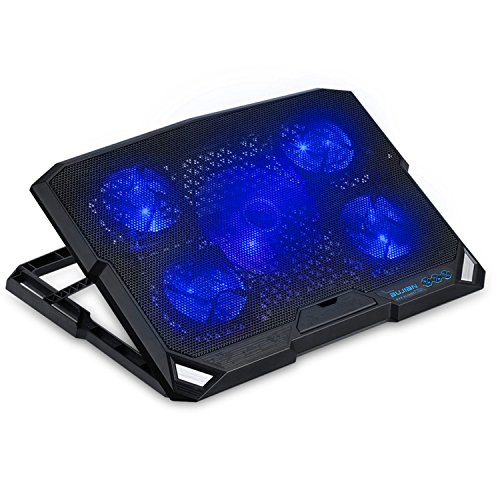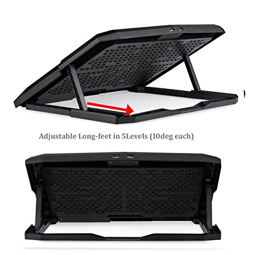 -. Feature : [LAP USE SLIM&LIGHT]: designed for Gaming use,portable for 13-17inch laptops."0.99inch ultra-thin" and 2pound weight is perfect for LAP USE COOLING. / [FIVE TIMES AIR]: Decent airflow for cooling is provided by powerful 5fans(2"x4fans,5.6"x1fan spinning at 1200-2000RPM). Also Copper-coil winding feature can bear thousands of spinning to ensure a longer lifetime. / [FRONT TOUCH SWITCH DIM-SPEED]: Just one slight touch to turn off all "LED GLOW" and all 5fans. and the speed can be adjustable in 5Levels so energy-saving . / [PERFECT VISUAL&TYPING ANGLE]: Adjustable 5Levels-Stand(10deg each) ensures A better visual or typing angle to relieve wrists&shoulder aching. MORE AIR is pulled from backside gap,and u can apprantely feel the air through the pad holes. / [EXTRA USB Ports]: One for power supply from notebook, the other for Mobile/U disk,U wont miss any portable USB devices at all with the cool mat.