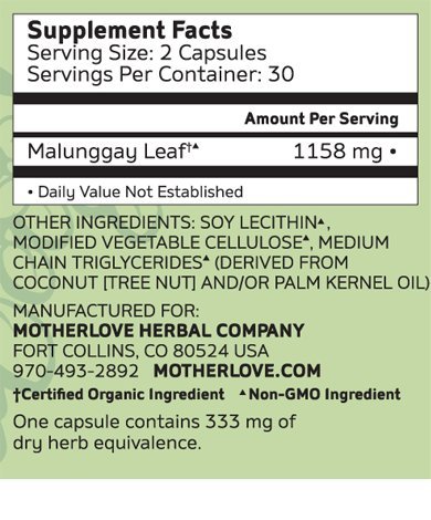 Studio : Motherlove Publisher : Motherlove Binding : Health and Beauty Product Description The nutrient-dense herb Malunggay (Moringa) has been used by generations of breastfeeding women for lactation support and is the active ingredient in Motherlove's Malunggay (Moringa) Herbal Breastfeeding Supplement. Known as the "miracle tree" for its widely recognized nutritional benefits, it is indigenous to India and the Phillippines and is considered a natural and effective way to help support breast milk supply. Made with certified organic malunggay (moringa) leaf. Discuss product use with a healthcare professional before using during pregnancy. There are many different causes of low breast milk supply and not all herbs work for everyone. In order to determine the best method or product to help, please ensure you are working with a lactation consultant to determine the root cause of any breast milk supply issues you may be experiencing. We offer a full refund for any reason if you are not satisfied. 0