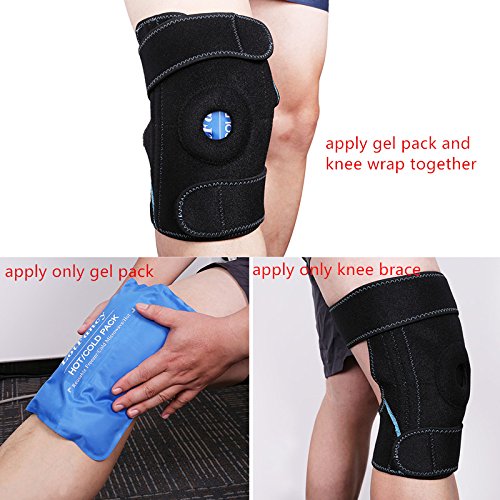 -. Feature : 3 IN 1 THERAPY WRAP: apply gel pack and compression knee wrap together to get cold / hot therapy; apply only gel pack to any desired areas as an ice pack or heating pad; apply only knee brace to support and stabilize painful knee joints / THERAPEUTIC NEOPRENE SUPPORT WRAP: two layer pouches allow for customizable hot & cold treatment; open design for knee bend and stitched buttress provides added support and overall stability by eliminating slide; metal spiral stays on both sides help provide flexible support / SAFE AND REUSABLE: 10" x 10" gel pack can be frozen, heated or microwaved and keeps flexible after frozen even at 0°F(-18℃); CE and FDA approved / MULTIPURPOSE: pain relief and recovery for fibromyalgia, tendonitis, arthritis, and sports injuries; excellent for people suffering from swelling, runner's knee, tennis elbow, golfer's elbow and more / ONE SIZE FITS MOST: therapeutic neoprene knee support with 100% hoop and loop velcro coverage, adjustable size for both men and women