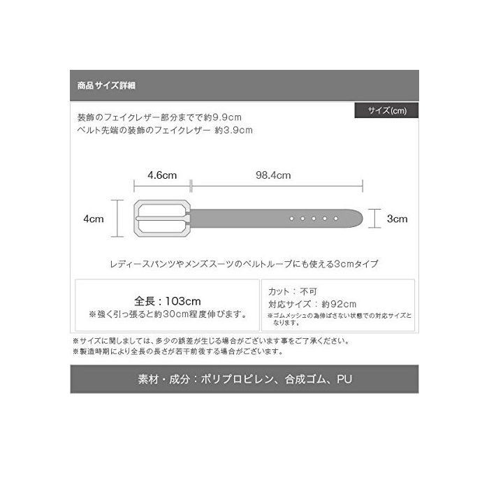벨트폭:약3cm 대응 사이즈:약92cm까지 ※고무 메쉬 이기 때문에 늘리지 않는 상태에서의 대응 사이즈 입니다.컷 불가
