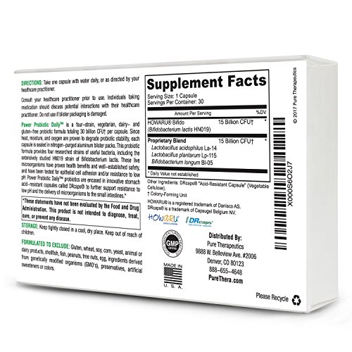Power Probiotic Daily is a four-strain vegetarian, dairy- and gluten-free probiotic totaling 30 billion CFU† per capsule. Since heat, moisture, and oxygen are proven to degrade probiotic stability, each capsule is sealed in nitrogen-purged aluminum blister packs to assure viability. This probiotic formula provides four researched strains of useful bacteria, including the extensively studied HN019 strain of Bifidobacterium lactis. These live microorganisms have proven health benefits and well-established safety, and have been tested for epithelial cell adhesion and/or resistance to low pH. Power Probiotic Daily probiotics are encased in innovative stomach acid resistant capsules called DRcaps to further support resistance to low pH and the delivery of microorganisms to the small intestines. All Pure Therapeutics Formulas Meet or Exceed cGMP Quality Standards. This product is manufactured in the United States in a GMP certified facility.Feature