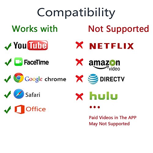 APPS SUPPORTED:Work with YouTube,Office,Safari,Chrome and Facetime,But not support NETFLIX,Amazon Video,Directv and hulu,and paid videos in the APP may not supported