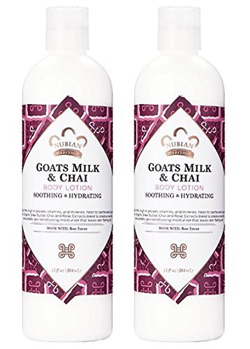 This bundle includes two 13 oz bottles of Nubian Heritage Goat's Milk & Chai Body Lotion