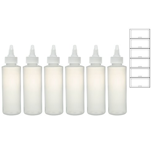 Twist Top Spout Natural Clear Refillable (BPA Free) Plastic Squeeze Bottle - 4 oz Set (6 pack) + Labels