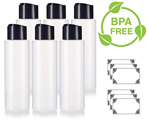 16 oz / 500 ml Professional Natural Clear Refillable Plastic Squeeze (BPA Free) Bottle with Wide Black Disc Cap Lid (6 pack) + Labels for Shampoo, Conditioner, Body Wash, Lotion, and more