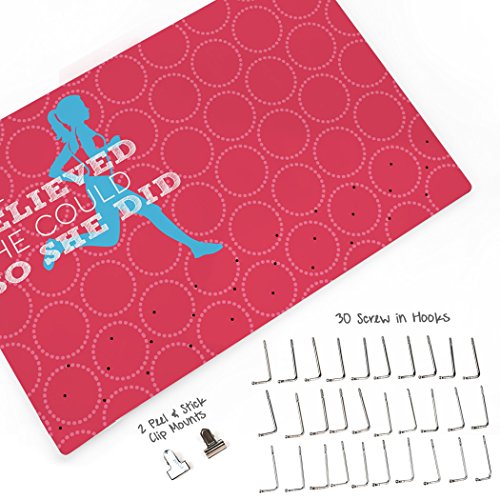 - EASY INSTALLATION! Features two recessed slots in the back for quick and easy installation. Includes 30 heavy duty screw-in hooks that can hold up to six medals each and two (2) self-adhesive race clips for all your bibs. As an added feature, each hook is capped with a removable decorative ball that can be removed to add our exclusive race hook tags. (sold separately).
