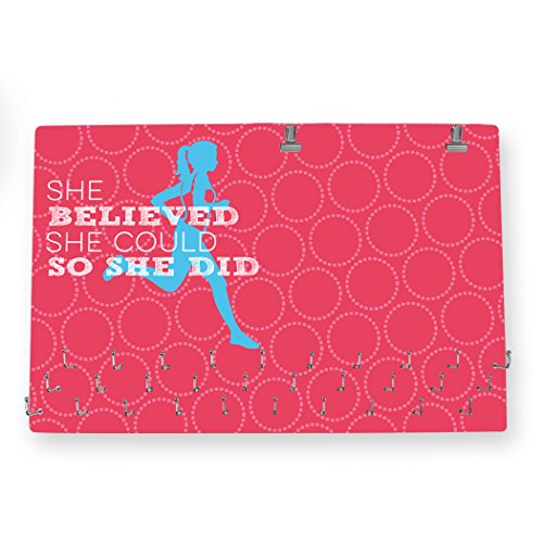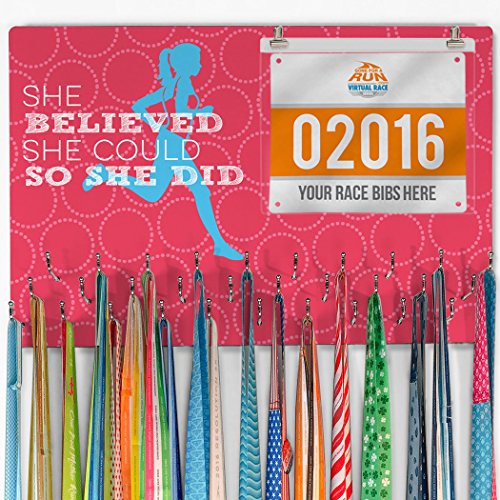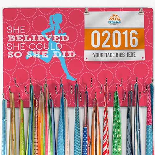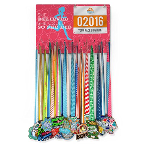 - HOOKED ON MEDALS & BIBS! Our She Believed She Could Hooked On Medals & Bib Hanger is the perfect way to display your collection of race bibs and medals from marathons, half-marathons, 5K, 10K, triathlons, road races, and other athletic events. Choose your unique design and color from our large variety of options to represent your own personal style!