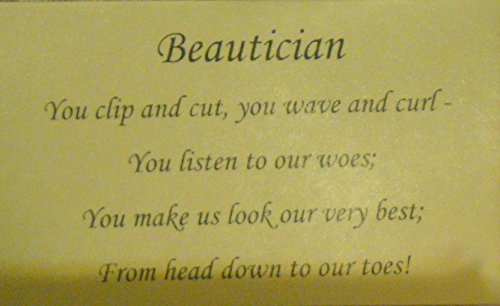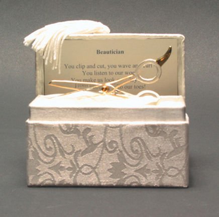 Inside of box contains this sentiment message: * You clip and cut, you wave and curl; You listen to our woes; You make us look our very best; From head down to our toes!