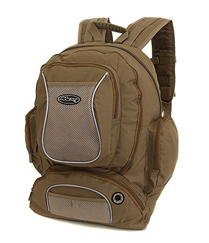 -. Feature : Material: 600D Polyester for durable daily use. Available in: Black, ACU Digital Camo, Navy Digital Camo, Tan / Music Audio Headphones port: listen to your favorite music hands-free / 2 zippered front pockets, 2 zippered front pockets, 2 front mesh pockets, 2 side zippered gusseted pockets, 1 main (fits up to 17" laptop) and 1 middle zippered compartment; Organizer: 2 open pockets, 2 pen slots / Padded adjustable shoulder straps; Adjustable chest & waist straps with buckle snaps; Rear padded panel for extra comfort / Dimensions: 19.5" x 13" x 8"; Volume: 2000 cu. in.