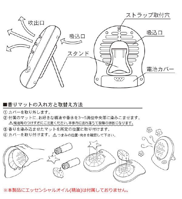 | 付属品 | 香り含浸用詰替マット(星形)×5枚、テスト用単4形乾電池×1個、ストラップ×1本、取扱説明書兼保証書(保証期間:3ヶ月) |