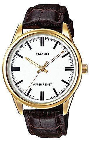 Brand, Seller, or Collection Name:Casio Model number:EAW-MTP-V005GL-7AUDF Part Number:MTP-V005GL-7A Item Shape:Round Dial window material type:Mineral Display Type:Analog Clasp:Buckle Case material:Stainless steel Case diameter:40 millimeters Case Thickness:8 Band Material:leather Band width:18 millimeters Band Color:Brown Dial color:White Special features:N/A Movement:Quartz