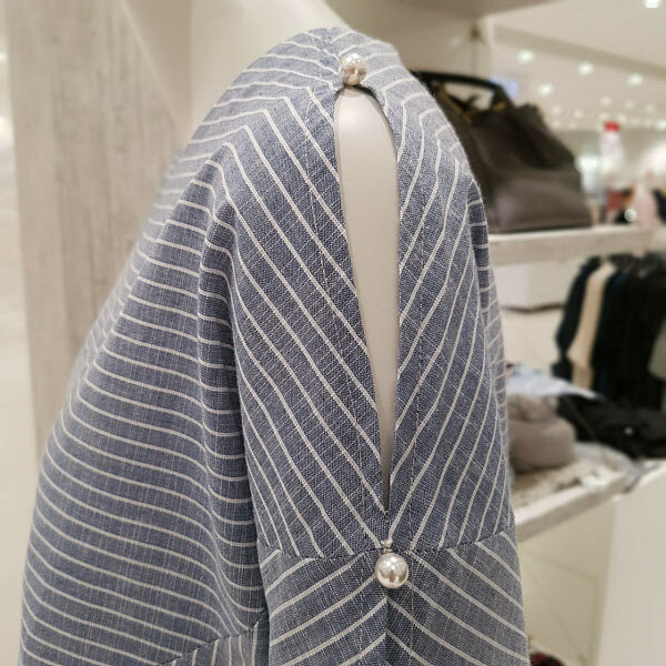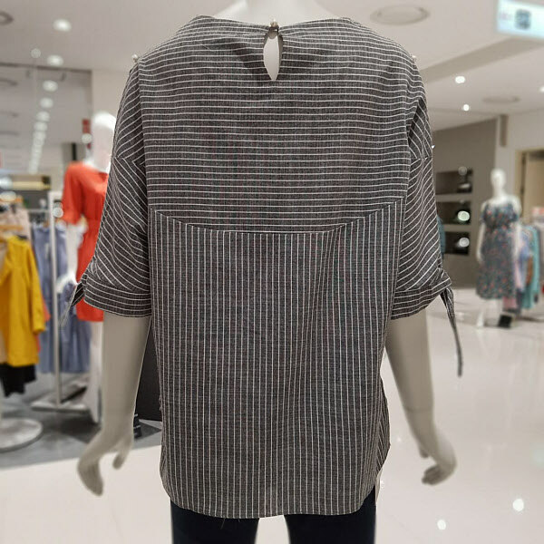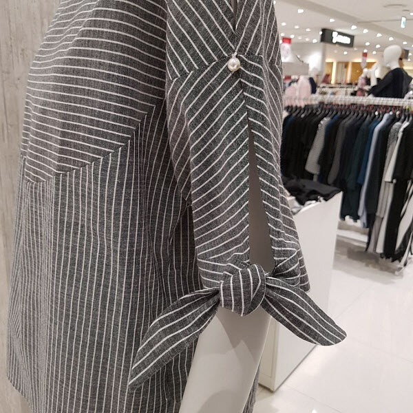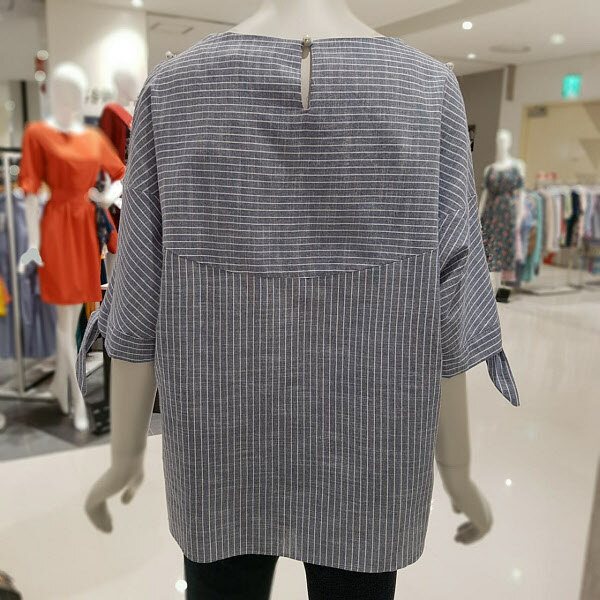 면과 레이온이 혼방된 원단에 스트라이프 패턴이들어가 케쥬얼 하면서도 여름에 시원해 보이는 소매트임 블라우스입니다 소매끝은 리본을 묶어착장할수 있게 디자인하여 단품으로 입기 좋은디자인 입니다 스트라이프 패턴이 들어가 무난하게모든 하의류와 코디하기 좋은 상품 입니다기장은 25 1/2 인치 입니다