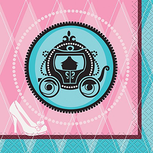 - Birthday napkins feature classic images of a carriage and glass slipper on an elegant teal and pink background