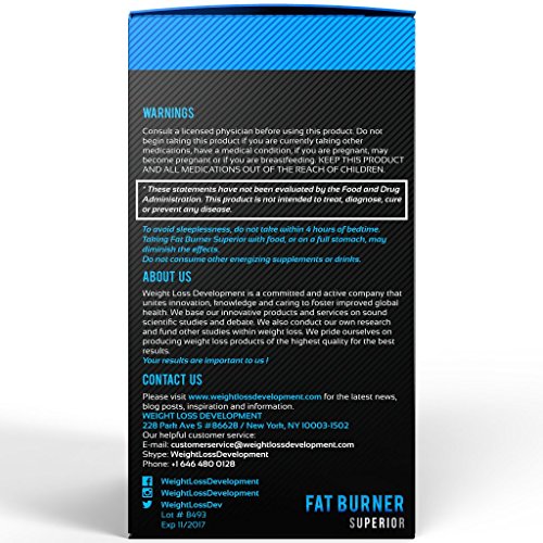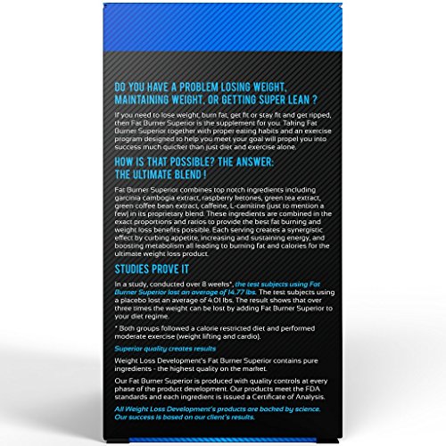 - Feature : STUDY PROVED SUPPLEMENT! In a 8 week study two groups were put on a calorie restricted diet, one group used Fat Burner Superior & the other group used a placebo. The Fat Burner Superior Group LOST AN AVERAGE OF 14.77lbs! The placebo group lost an average of 4.01lbs The results shows that Fat Burner Superior is highly effective and can help you lose more than 3 times the weight during dieting compared to placebo. This innovative blend is a winner within the fat burner Weight Loss Supplements. / ULTIMATE BLEND! Fat Burner Superior is put together with science backed ingredients in a perfect ratio to aid the fat burning process, promote weight loss, reduce body fat, reduce belly fat, stop indulge bulking, suppress appetite, add energy during diets. It is excellent for diuretics. Proven Effectiveness as a Stand Alone Weight Reduction Product. It Also Combines Well With Your CLA Conjugated Linoleic Acid, detox & cleanse weight loss products, weight loss beverage powders & carb blocker. / EXCELLENCE and SATISFACTION! We are a small American family run business and put all our efforts in having 100% Satisfied Customers & The Highest Quality Products. The best ingredients in Sports Nutrition Thermogenics - Garcinia Cambogia, Forskolin, Green Coffee Bean Extract, L-carnitine, Raspberry Ketones, Green Tea Extract, Yohimbe & Capsaicin. Our Products Meet The FDA Standards. Each Ingredient is Issued a Certificate of Analysis. Our success is based on our clients' results. Made in USA. / BEWARE! To put together an effective blend with ingredients that really affect your fat is EXPENSIVE because of the raw material. Too many fat burners on the market are based heavily on caffeine and other CNS stimulants which gives you lots of energy and hyped feelings that are not burning fat, giving you stomach issues instead. The saying "you are what you eat" is true. Cheap Fat Burners of lower quality are less effective. Why flush money down the toilet? Choose superior quality! / *TRY WITHOUT RISK* -100% lifetime satisfaction guarantee, great customer service & two fantastic bonuses! A 30 day ticket to our Weight Loss Concierge Program where you can ask our certified Personal Trainers and Nutritionists any question about weight loss & management, diets, exercises and supplements. Additional bonus - Weight Loss Guide with plans, tips and inspiration that will help you reach your goals! This is a LIMITED OFFER - so choose 2 bottles to lose weight and click ADD TO CART!