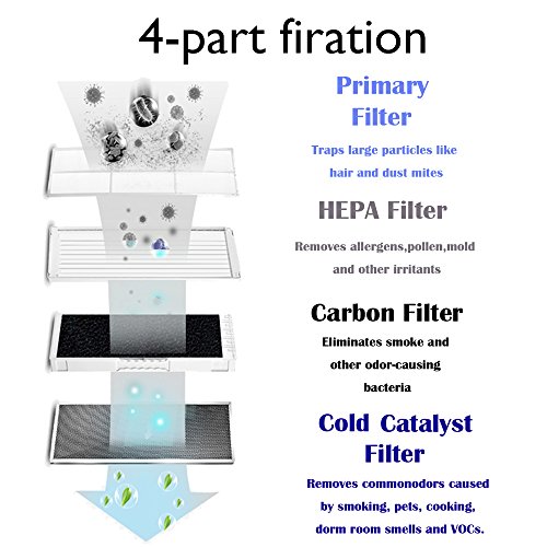 - 4 Filtration Stages : Ideal for people who suffer from allergies, nasal stuffiness,cough,sneezing,asthma,etc;Primary Filter + HEPA Filter + Activated Carbon + Cold Catalyst Filter reduce 99.9% of Allergens,Dust,Pollen,Smoke,Odors,Pet Dander,Formaldehyde,Mold spores and TVOC