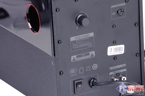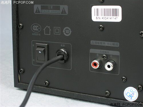 此外,这里还提供了一对儿音频输出接口,分别用以连接两个卫星音箱。其旁边是电源开关键,其硬度也有些偏大。也许有细心的朋友注意到了,它怎么没有音频输入接口呢?