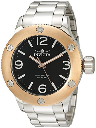 Studio : Invicta Publisher : Invicta Binding : Watch Product Description Stainless steel case with a stainless steel bracelet. Fixed rose gold-plated ion-plated bezel. Black dial with luminous rose gold-tone hands and index hour markers. Arabic numerals mark the 3, 6, 9 and 12 o'clock positions. minute markers around the outer rim. Dial Type: Analog. Luminescent hands and markers. Quartz movement. Scratch resistant mineral crystal. Pull / push crown. Solid case back. Case diameter: 52 mm. Round case shape. Band width: 26 mm. Band length: 8.25 inches. Fold over clasp with safety release. Water resistant at 100 meters / 330 feet. Functions: chronograph, hour, minute, second. Casual watch style. Invicta Russian Diver Black Dial Stainless Steel Mens Watch 18581. 0