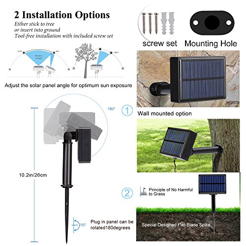 - [Dual Charging Mode & Installation Options] - Micro USB charging port allows external power supply when it's inclement weather or cloudy outside; included screw set and long spike support both wall mounted and plug into lawn without hurting the grass; 180 degree rotating system to adjust solar panel to follow effective sunshine