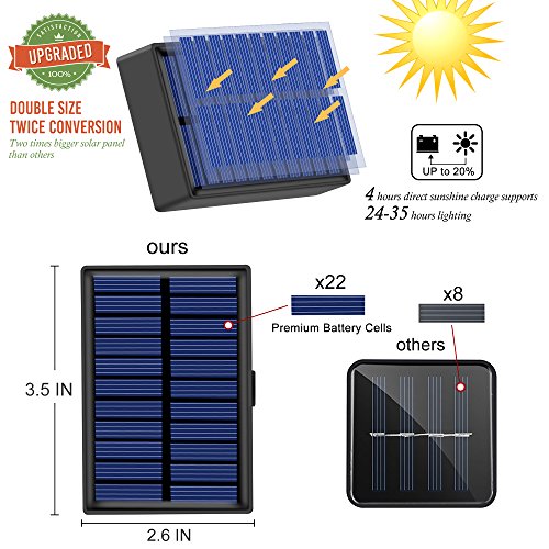 - [Twice Size,Double Efficiency] - Enlarged Sensitive Area which is upgraded to twice the size of most solar panels on market, absorbs more solar power during the same duration of sunlight, included 1 x 1200mA high capacity rechargeable battery supports 24-35 hours continuing lighting after 4-6 hours full charging under sunshine