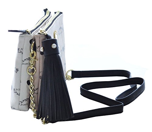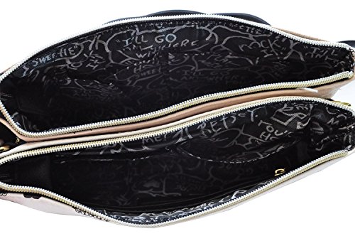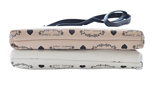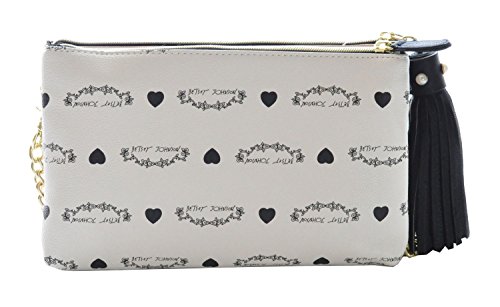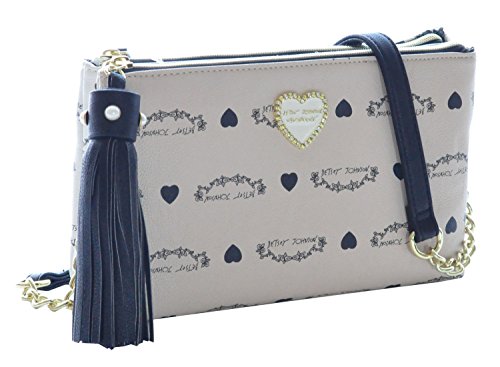 For the perfect blend of fashion and function, get the stylish Betsey Johnson Multi Compartment Day Crossbody Messenger. Purse is constructed grey and blush banner heart printed faux leather exterior, front cream Betsey Johnson hardware plate, blush tassel zip pull, front and back pockets opens to fully lined interior with wall zip pocket and 2 slip pockets, detachable chain detail Cross-body strap with 24" shoulder drop offers security while wearing.Feature