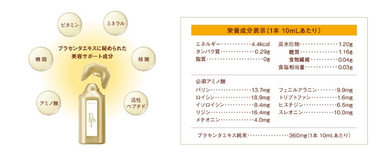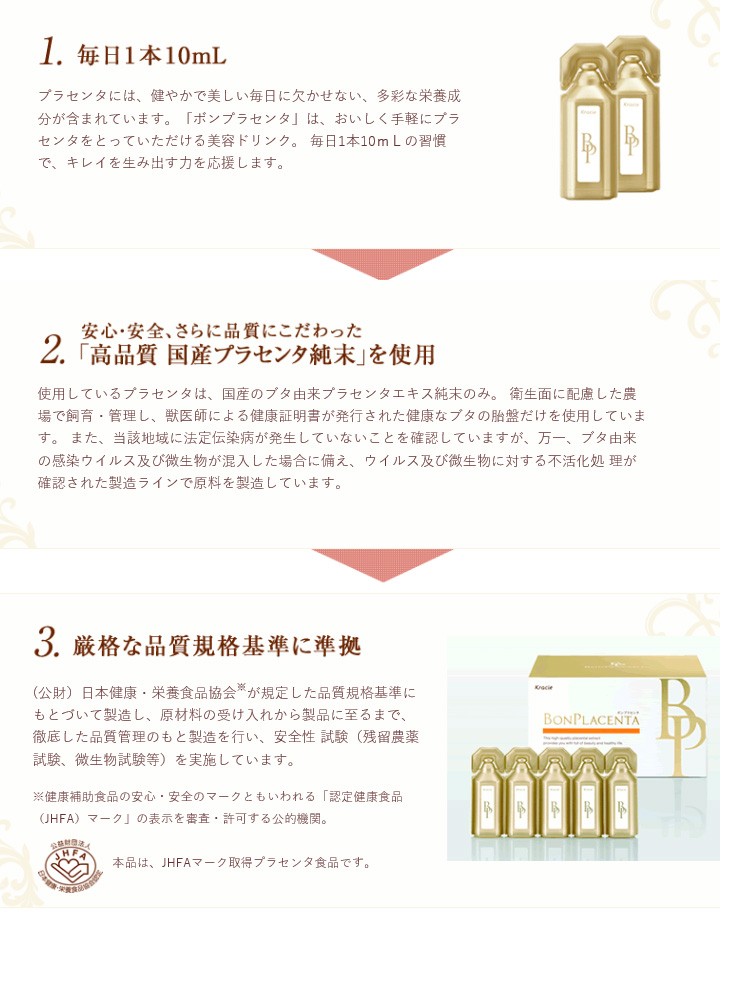 毎日1本10mLの習慣で、キレイを生み出す力を応援します。≪美容ドリンク プラセンタボンリッチ 人気の理由≫【毎日1本10ml】プラセンタには、健やかで美しい毎日に欠かせない、多彩な栄養成分が含まれています。「ボンプラセンタ」は、おいしく手軽にプラセンタをとっていただける美容ドリンク。日1本10mLの習慣で、キレイを生み出す力を応援します。【高品質な国産プラセンタ純末使用】使用しているプラセンタは、国産のブタ由来プラセンタエキス純末のみ。衛生面に配慮した農場で飼育・管理し、獣医師による健康証明書が発行された健康なブタの胎盤だけを使用しています。【厳格な品質規格基準に準拠】(公財)日本健康・栄養食品協会※が規定した品質規格基準にもとづいて製造し、原材料の受け入れから製品に至るまで、徹底した品質管理のもと製造を行い、安全性 試験(残留農薬試験、微生物試験等)を実施しています。※健康補助食品の安心・安全のマークともいわれる「認定健康食品(JHFA)マーク」の表示を審査・許可する公的機関。≪美容と健康を生み出すプラセンタエキス含有≫1本で贅沢にプラセンタエキス純末360mg。生み出す力を目覚めへ導く、プラセンタドリンク