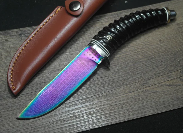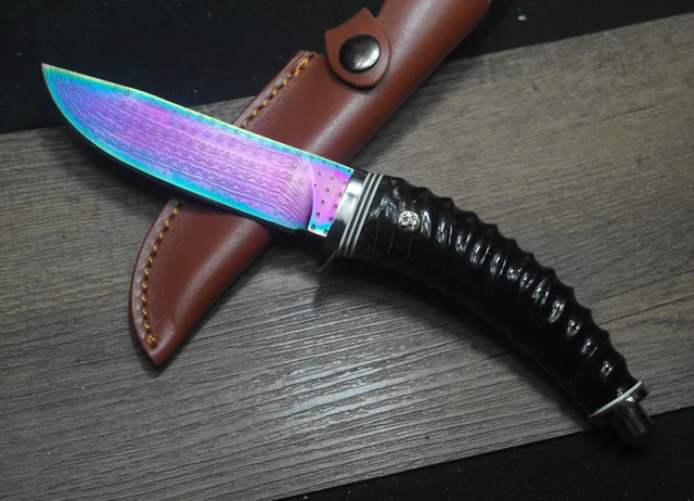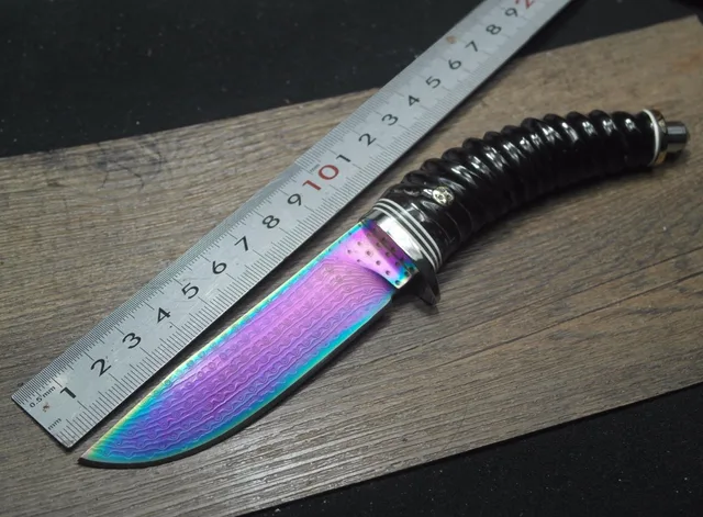| [해외] 다마스커스 스틸 나이프 블레이드 사냥 칼 경적 + G10 + 구리 핸들 수제 다마스커스 단조 칼 선물 칼 |