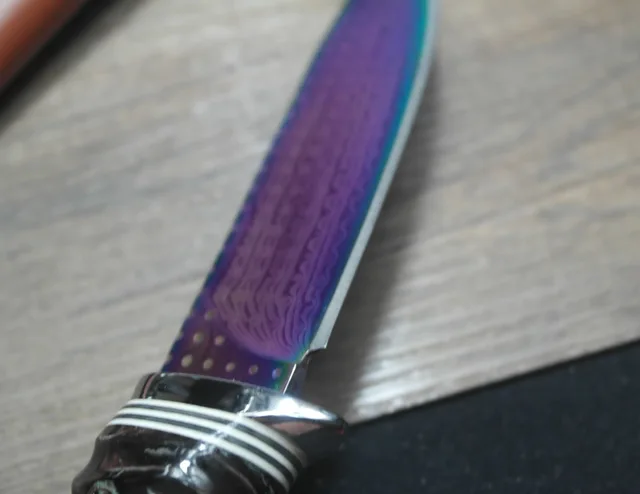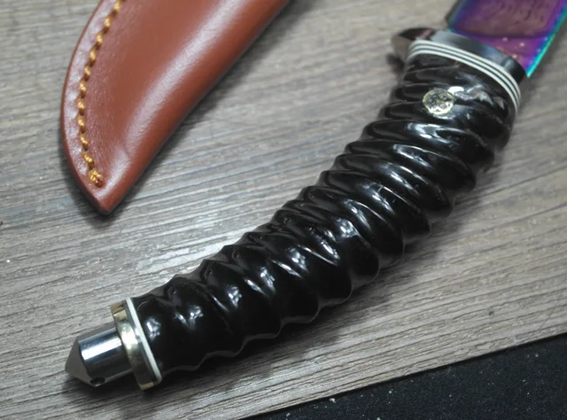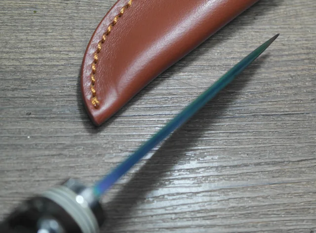 상품 내용 전체 길이: 245 미리메터 블레이드 길이: 98 미리메터 핸들 길이: 147 미리메터 블레이드 폭: 29 미리메터 블레이드 두께: 4 미리메터 블레이드 재질: 다마스커스 스틸 무게: 220 그램 (포장) 경도: 58 HRC 표면: 다마스커스 단조 핸들 재질: 영양 경적 + G10 + 구리 감사합니다! 포장 상세