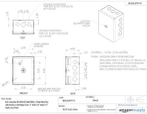 BUD Industries JBH-4956-KO Steel NEMA 1 Sheet Metal Box with Knockout and Hinged Cover, 6" Width x 8" Height x 4" Depth, Gray Finish