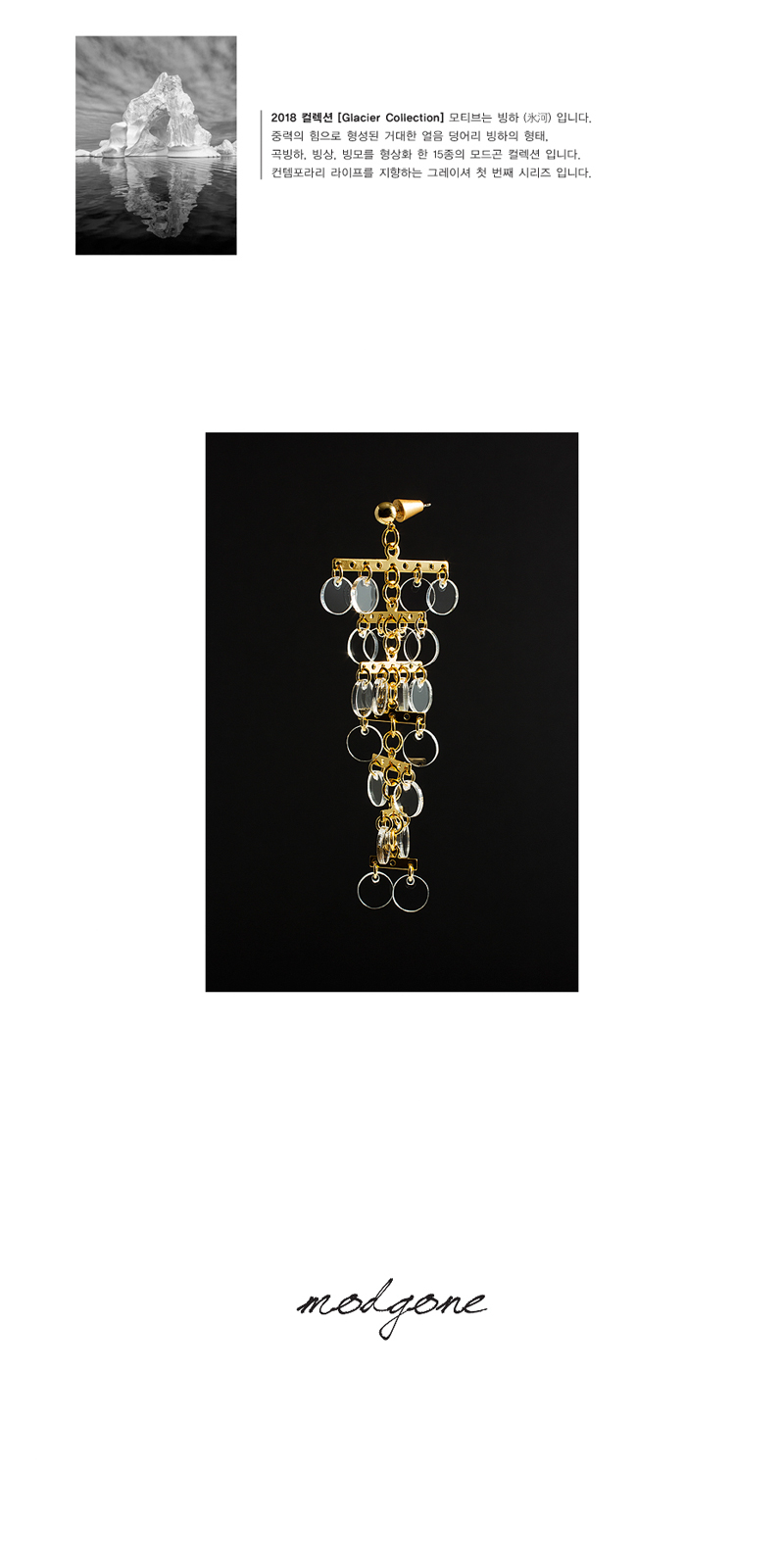 | Drops of ice earring 달랑거리는 얼음방울 모양의 장식이 달린 드롭귀걸이입니다. 귀걸이침은 티타늄침으로 제작되었습니다. 어디서도 만날 수 없는 오직 모드곤에만 있는 Only Modgone 제품입니다. 모드곤에 직접 디자인 및 도금을 진행하며, 핸드메이드로 제작되어 1~3일 정도 기간이 소요될 수 있습니다. Color: Gold Size: L-4*10.5cm, R-4*10.5cm Weight: L-10g, R-10g Material: Brass+Gold Plated, acrylic |