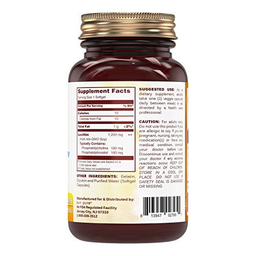 Your body requires tiny amounts of healthy fats to function properly, and soy lecithin is one of the best sources of fat for a complete diet. Studies suggest that lecithin from soybeans has numerous benefits like: Provides raw materials that are used for the structure and functioning of every cell in the body * Assists with the production of a vital brain chemical that is vital to nervous system function and important for memory * Promotes cardiovascular health * Aids in healthy digestion * If your health care professional has recommended that you add a soy lecithin supplement to your diet, Sun Pure Lecithin is the perfect supplement to choose because it's: MORE POTENT. Each lecithin high potency softgel contains a lecithin 1200mg dose, so you only need to take one of our lecithin softgels per day! * A BETTER VALUE. You'll get a 100day supply of soy lecithin softgels in just one bottle with Sun Pure! * HIGHER QUALITY. Our lecithin softgels are free of preservatives and artificial colors. They're made in the USA at a GMP certified facility. * SUITABLE FOR RESTRICTIVE DIETS. Our soy lecithin supplement is free of gluten, wheat, yeast, corn, milk, sugar and sodium. * Reap the benefits of a diet rich in lecithin soy by choosing the best lecithin supplement! Order Sun Pure Lecithin Dietary Supplement now!Feature