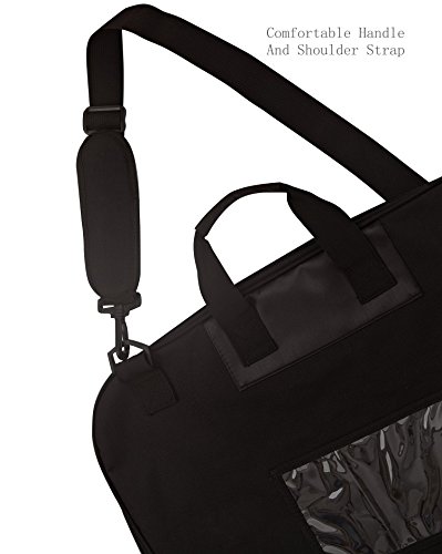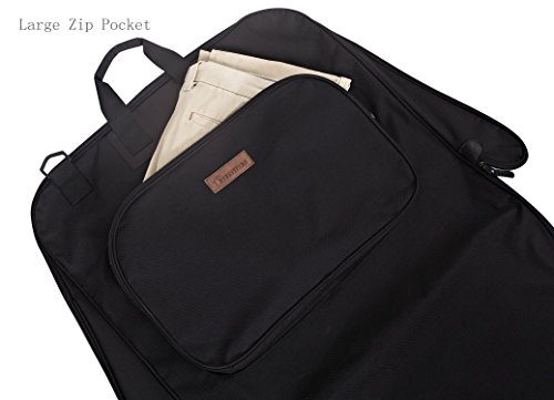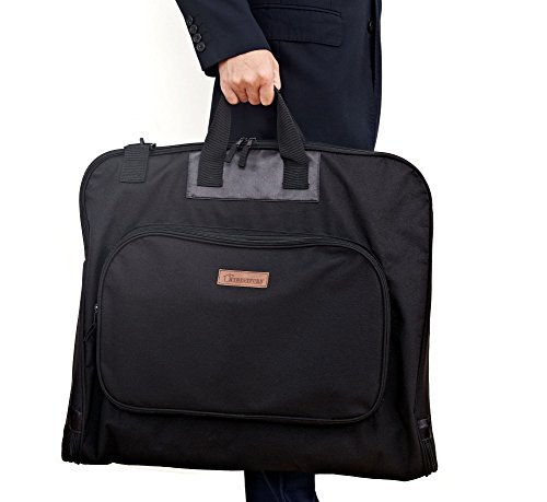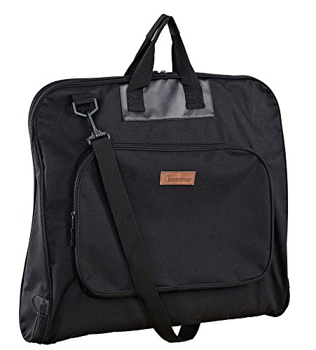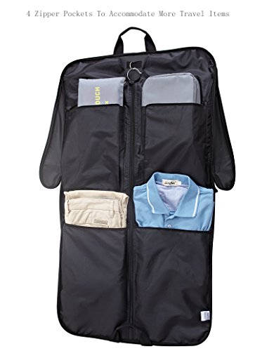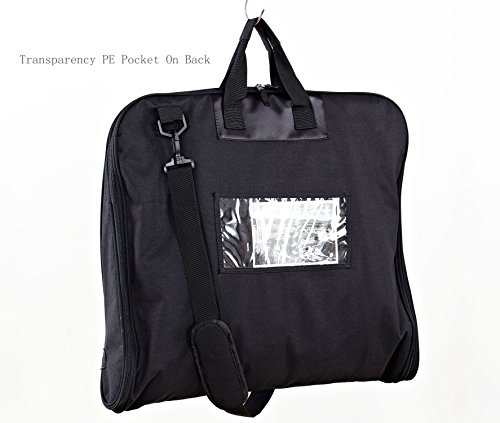 -. Feature : This carry on garment bag is made of waterproof 600D denier polyester outside, 420 denier polyester inside,which ensure your suit is neat, wrinkle free and dry. / Built in hook help easily hang the garments so clothes won't fall to the bottom of the bag / 5 zip closed pockets for suits, shirts,dresses and other accessories when traveling or making a wedding trip, one transparency PE pocket for boarding pass and laundry card, super large capability. / Comfortable handle and shoulder strap designed that help you travel more ease and comfortable. / Dimensions: 41L x 22.5W (inches), Folded Dimensions: 23L x x20.5W x 3D (inches) approximately, Weight: 1.65 pounds/0.75KG